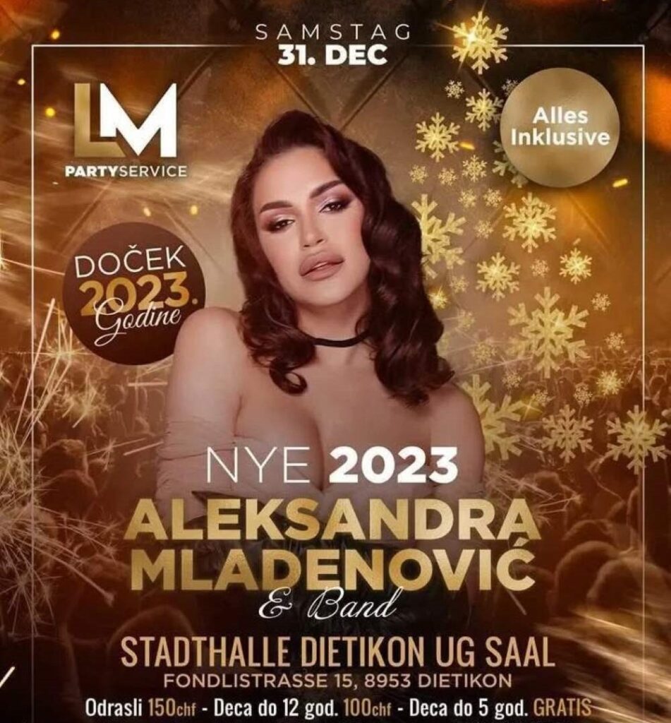 Doček Nove godine zaslužuje poseban ambijent i vrhunsku muziku – a upravo to donosi Aleksandra Mladenović Doček Nove godine 2023 u Cirihu. U prostoru Stadthalle Dietikon UG Saal, publika će imati priliku da uživa u fantastičnom muzičkom spektaklu koji spaja emociju, glamur i energiju.