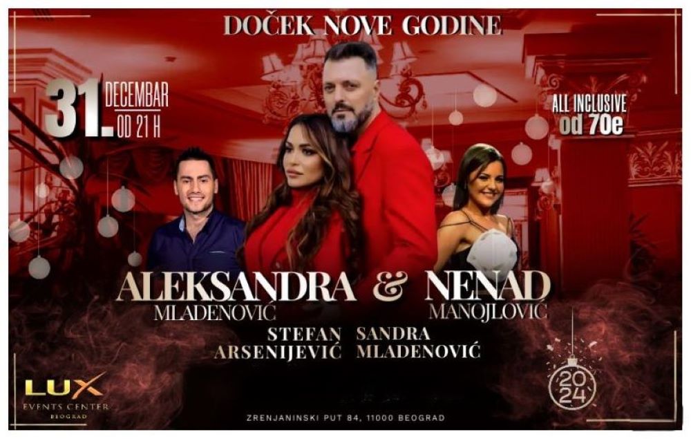 Ako tražite spoj vrhunske muzike, elegantnog ambijenta i prazničnog glamura, Aleksandra Mladenović Doček Nove godine 2024 u Lux Event Centru pravi je izbor. Ove godine Aleksandra Mladenović će, zajedno sa Nenadom Manojlovićem, Sandrom Mladenović i Stefanom Arsenijevićem, obezbediti veče puno energije, emocija i pesama koje volite.