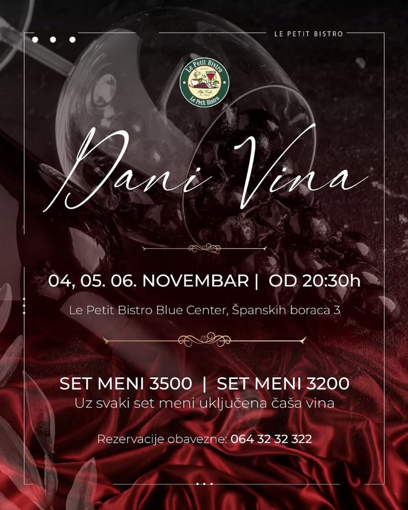 Postoje trenuci koji ne traže povod, već samo dobar razlog da se zaustavimo i uživamo. U mirisu vina, u ukusu koji traje, u razgovorima koji teku prirodno – kao i vino koje ih prati. Upravo takvi trenuci očekuju vas 04, 05. i 06. novembra od 20:30h, kada vas restoran Le Petit Bistro Blue Centar poziva da nam se pridružite na Danima vina – događaju koji slavi spoj ukusa, tradicije i uživanja.